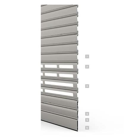 Estas persianas de seguridad de aluminio tienen una característica especial. Consiste en la colocación de lamas perforadas alternando con lamas de aluminio ciegas en la parte central de la persiana de seguridad autoblocante. La parte inferior y la parte superior se instalan lamas ciegas sin alternar con lamas perforadas.